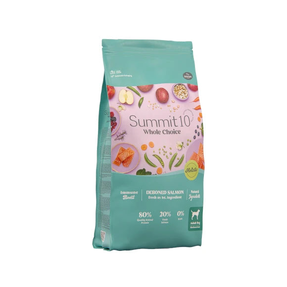 SUMMIT 10 WHOLE CHOICE ADULT SALMON 2 KG Alimento seco super premium para perros adultos, elaborado con salmón como fuente principal de proteína, rico en ácidos grasos Omega 3 y 6 para piel sana y pelaje brillante, con antioxidantes naturales, prebióticos y minerales quelados que fortalecen el sistema inmune y digestivo; formato de 2 kg y 10kg